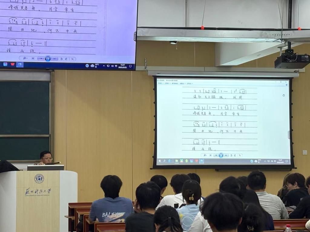 在昆曲与苏州文化关联的分享中,路教授现场以昆曲水磨调演绎《东城桂三首》。他轻敲桌面定调,演奏时不忘点拨换气技巧,唱罢即时提问互动,借诗句解读昆曲与吴地文化的联结,以专业演绎与生动互动,让听众直观感受昆曲魅力。